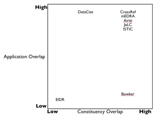 Crossref’s constituency of publishers overlaps heavily with Airiti, JaLC, mEDRA, ISTIC and Bowker. In the case of all but Bowker we also overlap in our application of the DOI in the service of citation identification. Bowker, though it shares Crossref’s constituency, uses DOIs for supply chain management applications.